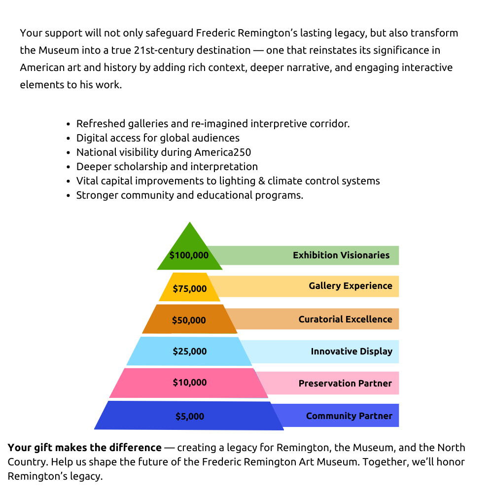 Your gift makes the difference—creating a lasting legacy for Remington, the Museum, and the North Country. Together, we’ll honor his vision and share his story with new generations.